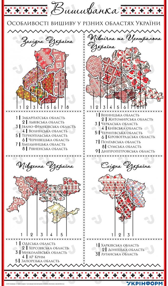 Існують безліч різновидів орнаментів, що утворювались протягом століть на теренах України. Різномаїття українських вишивок просто вражає. Не знайдеться мабуть ні одна країна на карті світу, щоб мала таку багатогранну культуру вишитого одягу.